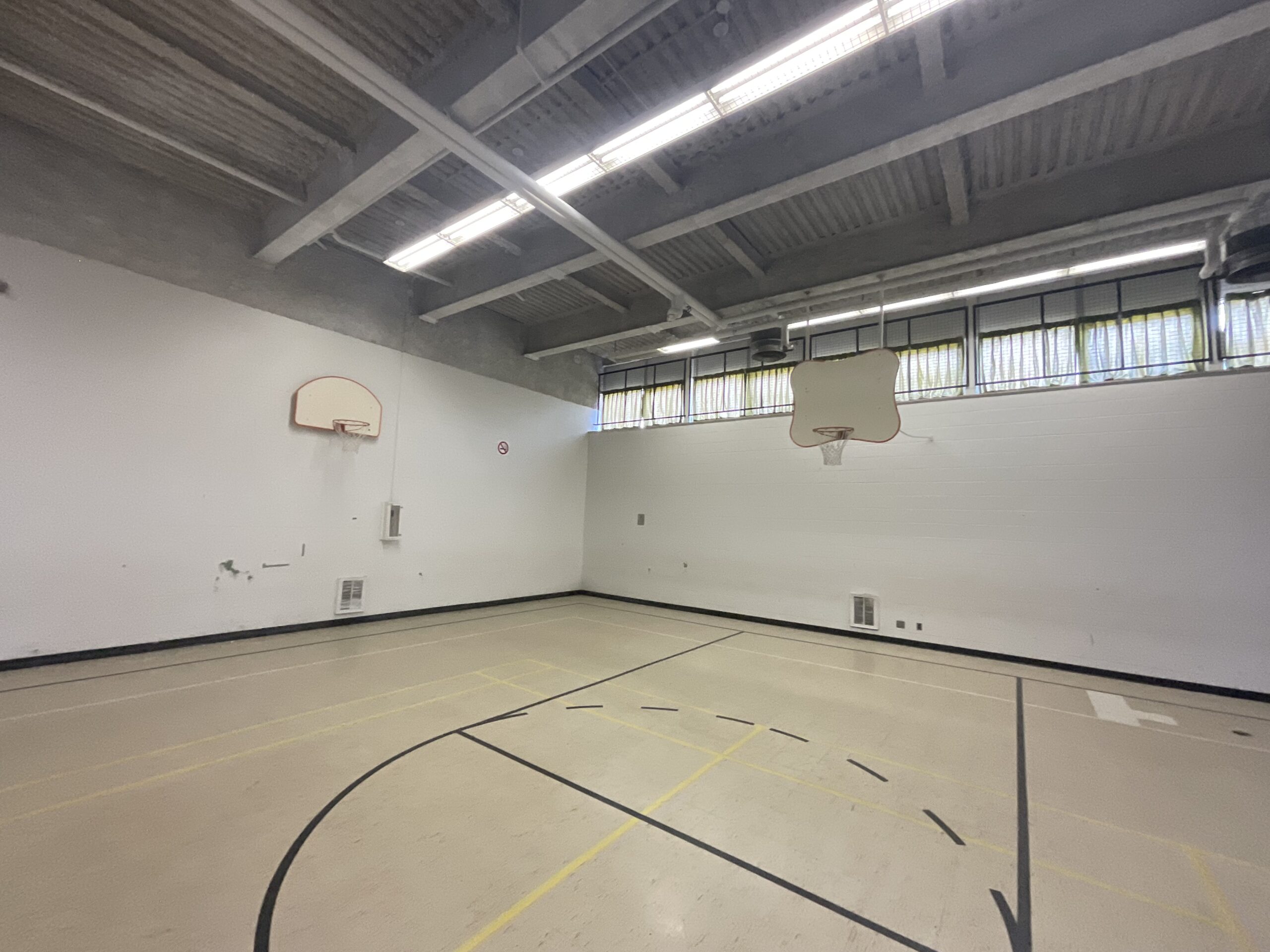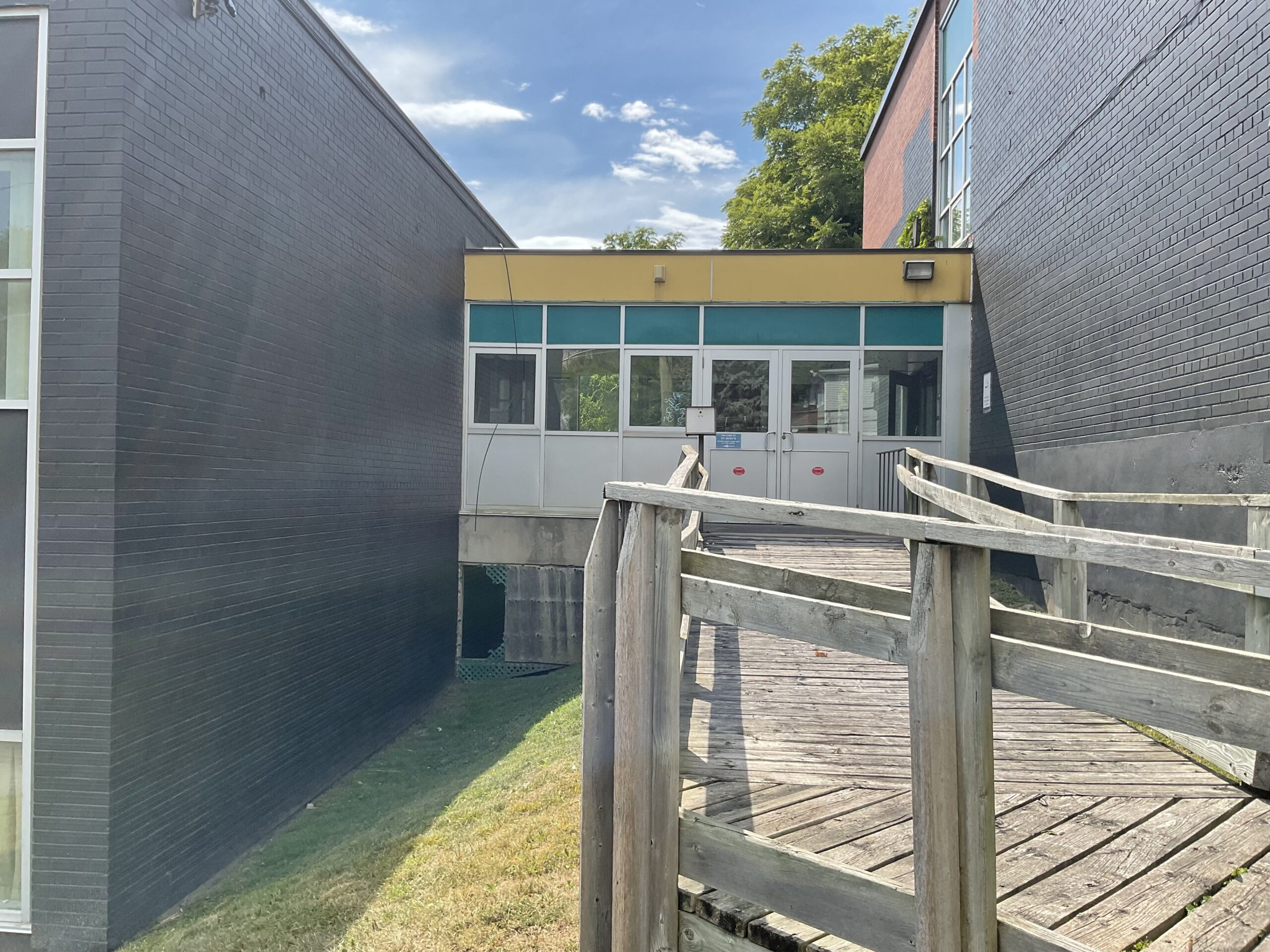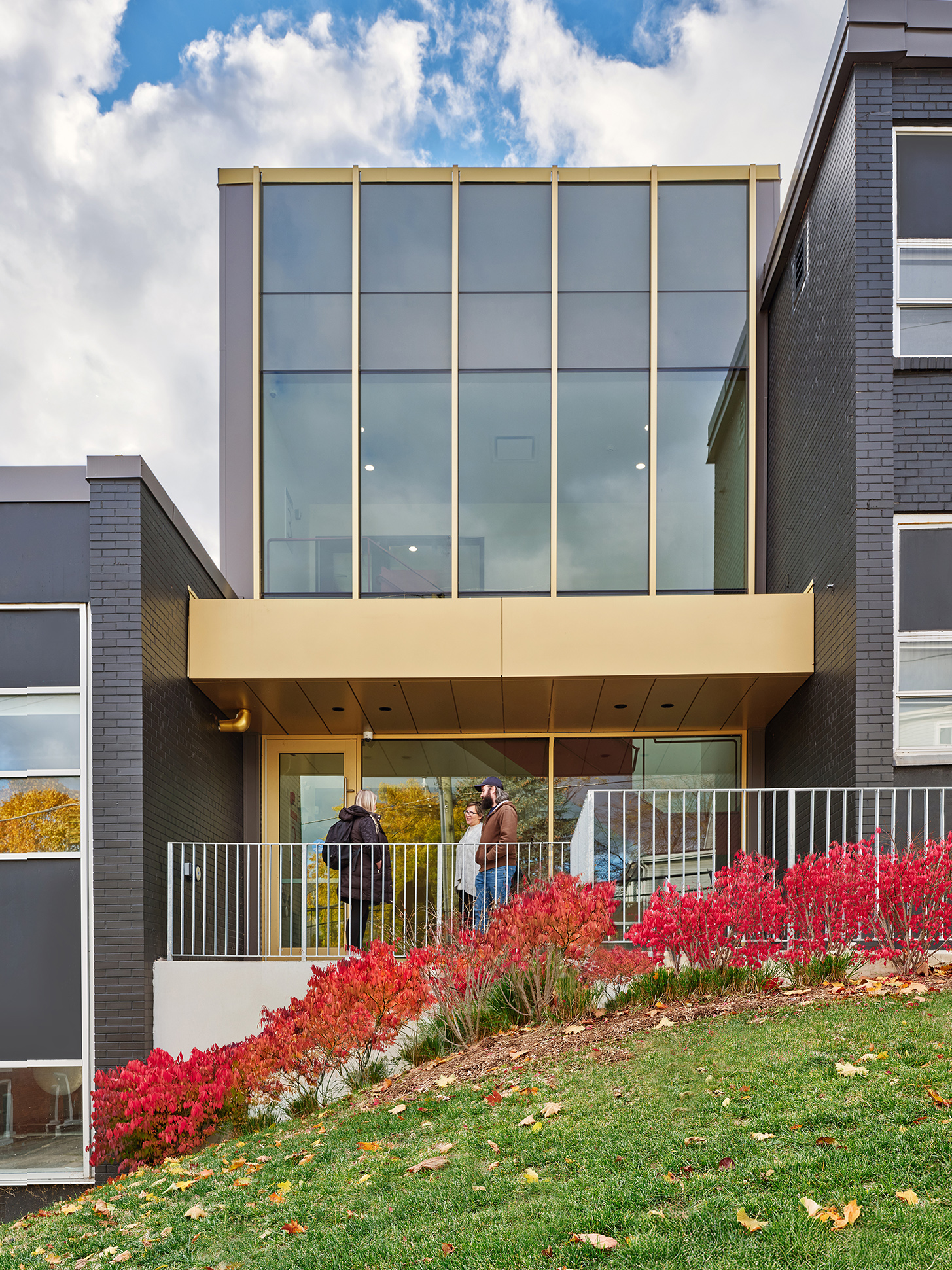 The existing school consisted of two buildings connected by a bridge and did not meet current accessibility standards. A new 2,000 square foot addition forms an accessible link between the two structures and includes an exit stair and elevator, making the new building fully OBC code compliant. New entrance canopies announce the main entrance and the newly built link. The east elevation façade at the accessible link features a glazed, champagne-coloured curtain wall to showcase activity on the inside.