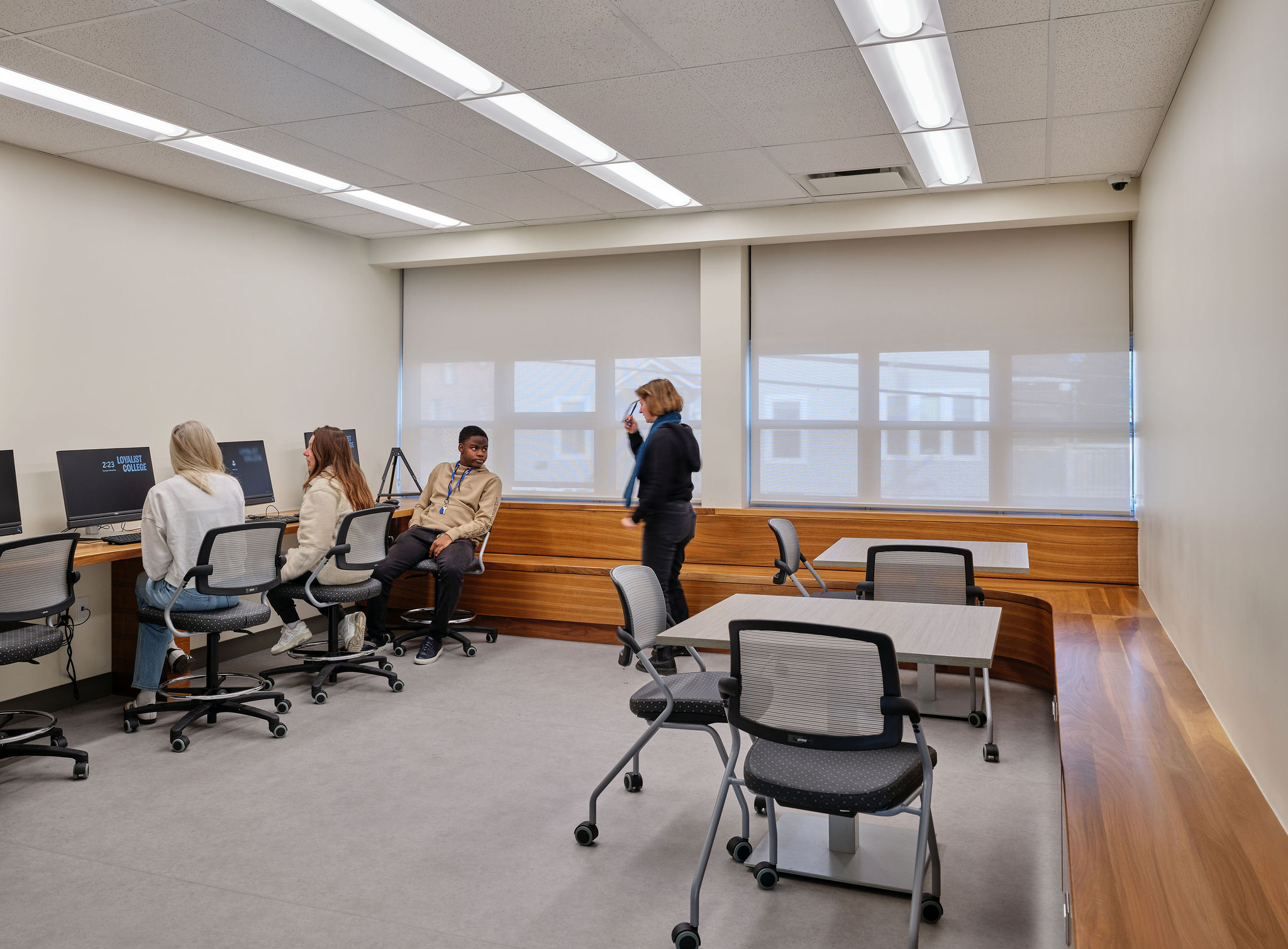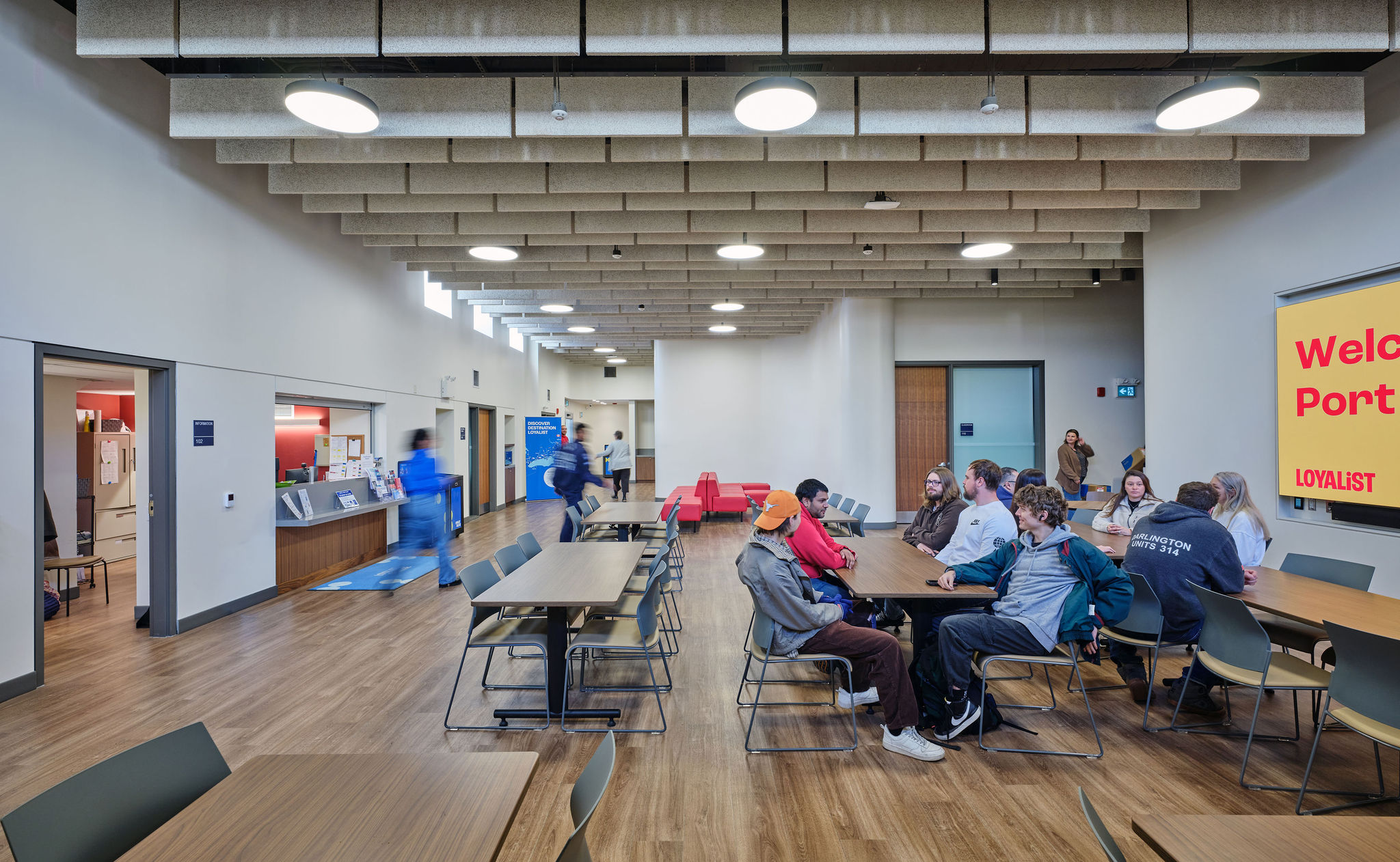 All common spaces have been refreshed and reinvigorated to facilitate a student-centred, collaborative centre of higher learning. As part of the main entry sequence, visitors enter a welcoming reception space with media wall. The former gymnasium has converted to a dynamic multi-cultural and multi-purpose space to accommodate a variety of activity ranging from student presentations to smudging ceremonies.